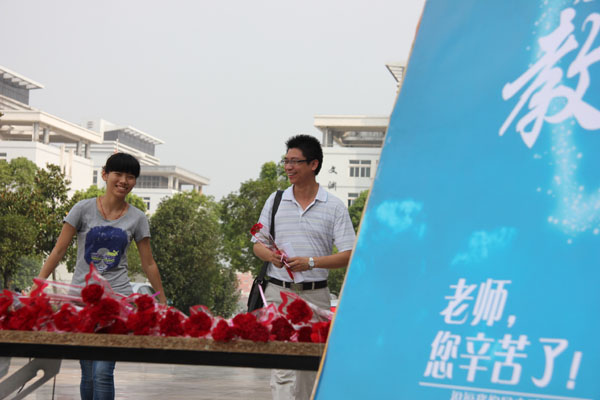 菱湖校区的教学楼前,龙山校区的文科楼、稼先楼、艺术楼、行政楼前,……,在老师上课、工作停顿的每一个地方,心怀感激的同学们代表全校学生为每一位老师献上了祝福的花——康乃馨。