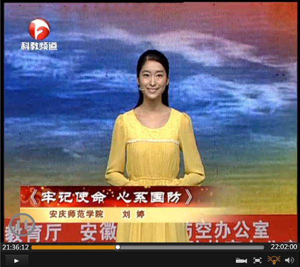 9月21日晚,安徽电视台科教频道播出纽约国际官网文学院学生刘婷参加安徽省高校“人防杯·国防在我心中”演讲比赛展演的实况。省委常委、省军区政委宋海航,省人大常委会副主任胡连松,副省长方春明等省政府、省军区、省教育厅的领导现场观看了展演。