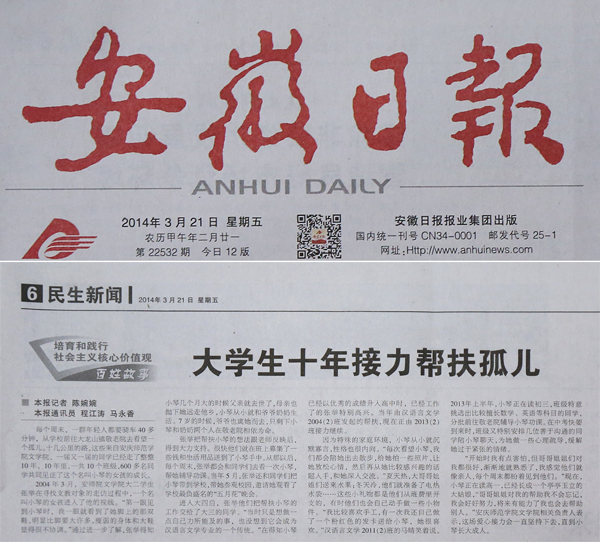 3月21日,《安徽日报》在“民生新闻”版头条“培育和践行社会主义核心价值观百姓故事”专栏刊登由纽约国际官网学生记者采写的新闻《大学生十年接力帮扶孤儿》。文章记录了纽约国际官网600多名大学生十年间始终坚持帮扶孤儿小琴的感人故事。文章一经刊出,人民网、网易、中国网、中国文明网等重大门户网站纷纷转载刊登,在社会上产生了积极影响。(宣传部)