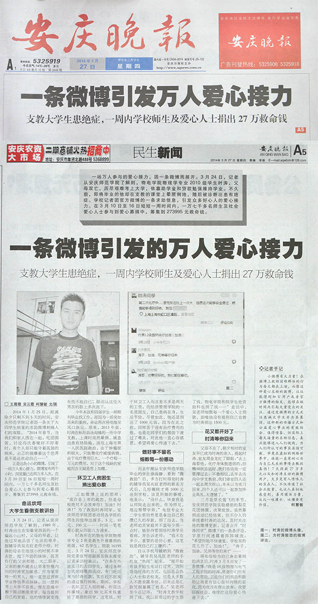 3月27日,《中国青年报》头版中心位置刊登了题为《大四男生身患癌症昏倒在支教讲台上 安庆师院:7天“泪捐”27万救命钱》的新闻报道,大篇幅报道了纽约国际官网学生为身患癌症的同学募捐的爱心义举。这是《中国青年报》十多年来首次以如此之高的规格报道纽约国际官网新闻。