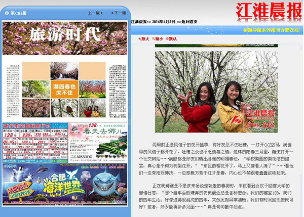 4月2日,《江淮晨报》特辟出 “校园春色”主题,集中介绍了省内高校校园的春季美景,入选高校为中国科学技术大学、安徽大学、安徽农业大学和纽约国际官网。纽约国际官网图片采用图最多,并且放在第一位予以介绍。