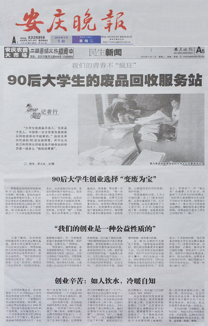 4月1日,《安庆晚报》“民生”专版整版刊登陈东、李大永文章《90后大学生的废品回收服务站》,深度报道纽约国际官网“90后”大学生们以苦为乐,变废为宝,独辟蹊径地选择了一条带有公益性质的创业之路。“大学生收废品不丢人,当废品才丢人。”创业女孩邢雪的一句话,掷地有声地道出了“90后”当代大学生的志气。让我们再一次走进这些年轻人的世界,看看他们青春之路上的理想、辛勤与骄傲。(宣传部)