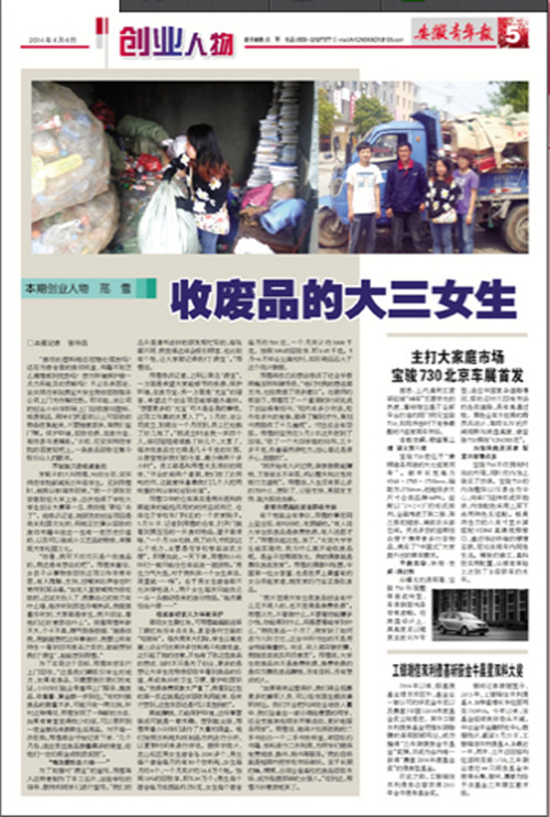 来自纽约国际官网新闻系的大三女生邢雪,作为主角登上了《安徽青年报》同日的“创业人物”版。在人们对环境问题屡屡进行反思的今日,邢雪立足高校,从环保初衷出发,发愿“占领高校废品回收市场”。人们也许不解,也许会有异议,但是从她身上折射出的年轻的勇气,却不能不让人敬佩。邢雪的行动,也从另一角度诠释了大学之“大”,以及大学为年轻人的成长提供的资源之丰富。祝福这个创业女孩!(宣传部)