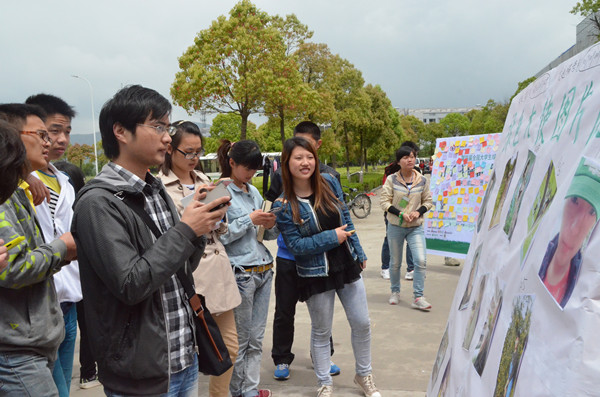 9点半左右,活动还没有正式开始,但已经有不少学生停下脚步,在展板前围了一圈又一圈。他们自发地排队发短信,刷微博,领种子和花盆,写下自己的环保宣言,“你环保,我环保,大家一起爱护我们的校园”,环保行动在我们周围,希望大家都可以为环保献出一份努力。”类似的环保宣言不胜枚举。