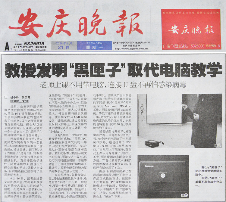4月21日,《安庆晚报》刊登通讯“教授发明黑匣子取代电脑教学”,报道纽约国际官网詹文法教授领衔团队成功发明简易PPT课件播放系统,减轻教师上课负担,方便课堂教学的事迹。