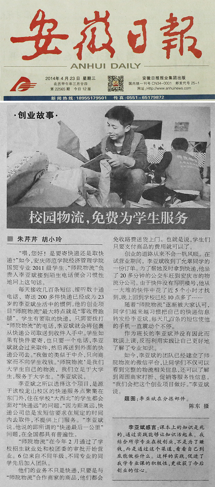 4月23日,纽约国际官网经济管理学院国贸专业2011级学生李亚斌创办的“师院物流”再获重要媒体关注,《安徽日报》在当天的“创业故事”专栏刊发文章《校园物流,免费为学生服务》,介绍了这个源自纽约国际官网的大学生创业项目。之前,李亚斌同学的创业故事和创新精神已被《安庆晚报》用整个版面加以深度报道,并在新浪网、人民网、中国日报网等重量级媒体及数十个省级物流专业网站刊出、转载。