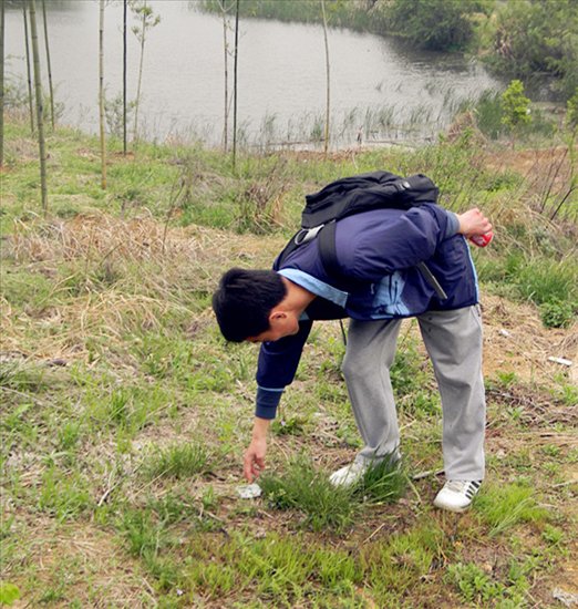 4月18日,记者见到于艳洋时,只见他身穿蓝色休闲服,灰色运动裤外加一个背包,手里提着一个塑料袋。于艳洋告诉记者,每次登山前,几乎都是这身装备。于艳洋的宿舍离后山有近20分钟的步行路程,记者和于艳洋,刚踏进山脚仅2米宽的土路时,他便眼疾手快地将一个铝制垃圾用手捡起。于艳洋笑着说,现在环境好很多,记得刚开始要将一半埋在泥土中的垃圾用手扒出来,有时必须走小路到树林里去捡人们丢下的垃圾。有一次,他看到山顶文曲亭附近有很多垃圾,部分路窄,坡度大,树林茂密,结果是下去容易上来难,手被树枝划伤了七八道伤痕。至今,在他的手上还能看到深浅不一的伤痕。记者了解到,每次来后山捡垃圾,往返大约需1-2小时,大约要走近10公里路。一年多的时间,他用脚步丈量出了一条后山环保的“小长征”。