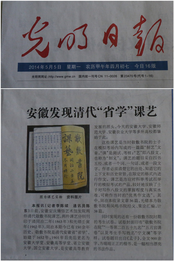 5月5日,《光明日报》在“文化新闻”版刊登记者李陈续、通讯员陈东采写文章《安徽发现清代“省学”课艺》。此后,省内报纸《安徽日报》(5月7日)和《安徽商报》(5月6日)也分别登载了反映同样内容的新闻《安庆发现清代“优秀作文选”》《150年前安徽最高学府“优秀作文选”现安庆 为我省目前可见最早的书院课艺》。与此同时,中国日报网、新华网、国学网、新浪网、中新网、中国社会科学网、中国作家网等国内重要门户和主题网站都在第一时间对此新闻进行了转载。