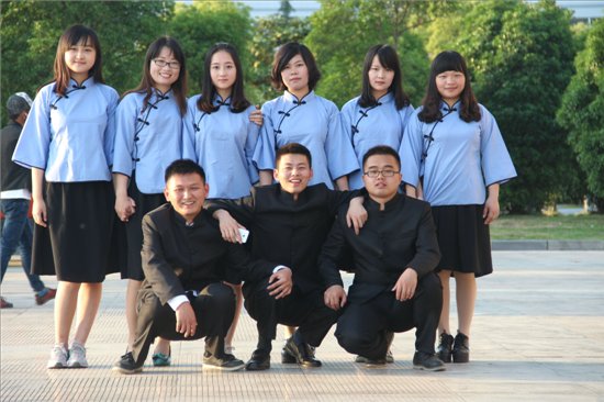 说起这一届毕业照学生们的装束,安庆师范学院外语学院师范1班的常相伟坦言,在继承了学校传统的基础上这一次有了很大的创新。“我们班同学很早就开始商量毕业照着装的问题,最终确定在学士服拍照过后,大家共同穿上民国学生装拍一组复古点的毕业照,认为很有特色也不会过分。”小常说,本以为自己班级的精心设计一定会在拍毕业照那天很出彩,没想到其他院系的设计让他们吃惊不小。“拍照那天每个班级基本都是分两步走,第一步清一色的学士服,大家整齐划一很快结束,接下来穿什么的都有了,文学院个别班级的男生穿起了礼服,女生穿起了婚纱愣是拍了一组学院派‘婚纱照’,成为我们校园一道亮丽的风景,还有些班级全体穿上定制的个性T恤,上面都是大家互相留下的寄语,摆起造型来也很壮观,总之是各有千秋啊。”