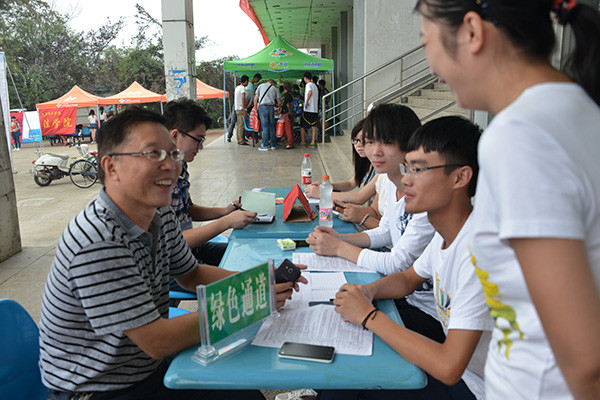 在新生入学“绿色通道”办理点,校领导向工作人员仔细询问“绿色通道”资助政策的办理流程和办理要求,叮嘱工作人员要认真做好细致周到的服务工作,充分利用各项政策帮助困难学生,确保不让一名新生因为经济困难而不能入学。