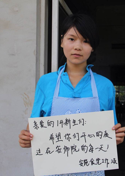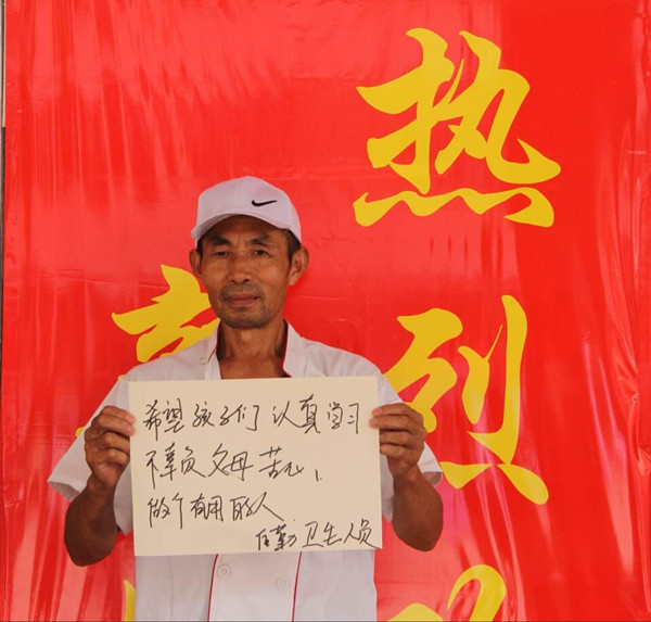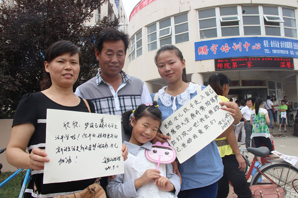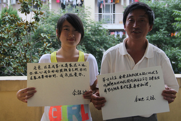编者按:2014迎新季,学生记者团构思了一个创意:进大学了,父母给子女写下一句话,子女给父母写一句话,让两代人在镜头前留下这珍贵的记录。与此同时,学生记者们没有忘记“校内资源”,把在一线工作的迎新人员也“请”到了画面上。他们未加修饰的字体,质朴的语言,同样在温暖着人心。组图在网络上发布后,反响良好,中国教育在线的官微也进行了转发。
