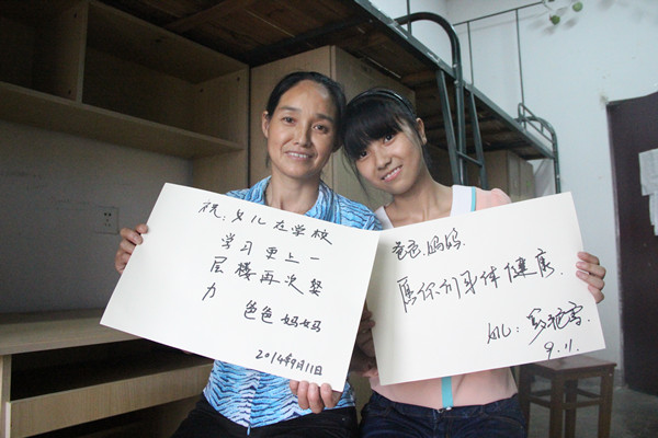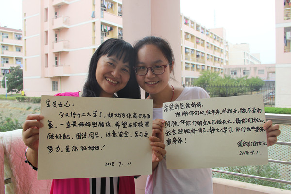 照片中的何乐和妈妈显得尤为亲密,这是14级法律专业的何乐长这么大第一次离开家,离开妈妈。当妈妈准备写给女儿一段话的时候,却坐在那久久没能落笔,或许此时妈妈的心中有千言万语想要对女儿说吧,但话到嘴边却又不知如何开口,有时候父母的愿望其实很简单。