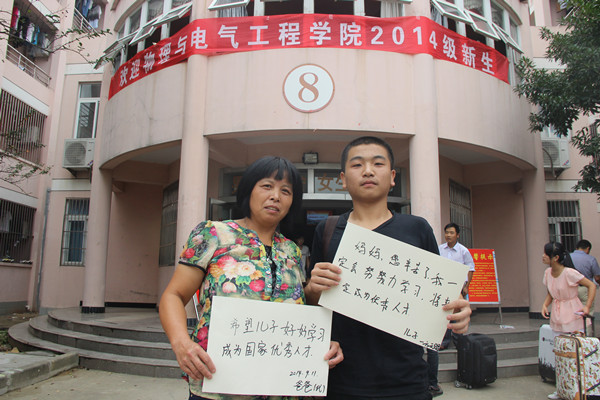 来自安庆枞阳的方天赐是一位腼腆的大男孩,虽然开学第一天的报名略显繁琐,但是有妈妈陪在身边,也是美好的一天。尽管妈妈不会写字,但是言语中无不透露着关怀。他是物理与电气工程学院的14级光电信息科学与工程专业的新生。