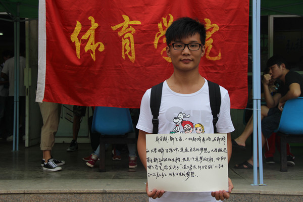 他叫朱传路,没有父母的陪伴,他一个人从阜阳坐了5个小时的大巴来到新学校,刚刚完成报名的他,正式加入了体育学院14级体育表演专业的大家庭,如今在这里即将展开新的生活,朱传路写下了对自己说的话。