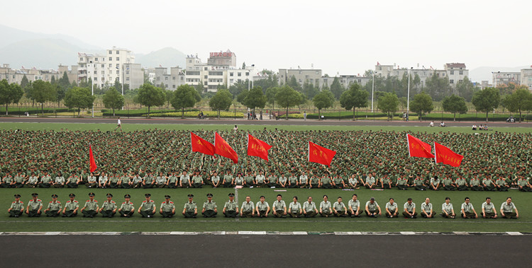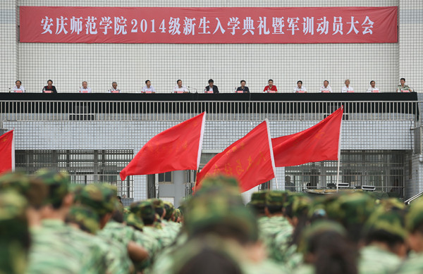 校迎新工作领导组和军训工作领导组全体成员、各学院新生班级辅导员、武警安庆支队官兵及2014级近5000名新同学参加了大会。(文/院办 图/宣传部)