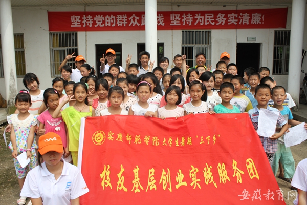 自7月3日起,安庆师范学院团委精心组织了458支实践调研团队,12000余名大学生紧紧围绕“为祖国勤学修德 以实践明辨笃实”的主题,奔赴安庆市周边城市和乡村,开展形式多样的践行社会主义核心价值观的暑期“三下乡”社会实践活动。 “大手牵小手?相约中国梦”关爱农民工子女夏令营团队的志愿者,活动中关爱留守儿童、了解大学生村官生活状况,他们用激情感染身边的人,带着奉献的心为基层群众送上最贴心的问候。