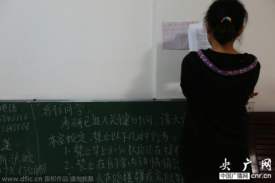 2014年10月22日,安庆师范学院校园外一家考研自习室,一名女生在一楼进出口处“面壁”背书,在她身旁的黑板上,写着有关考研复习的温馨提示。