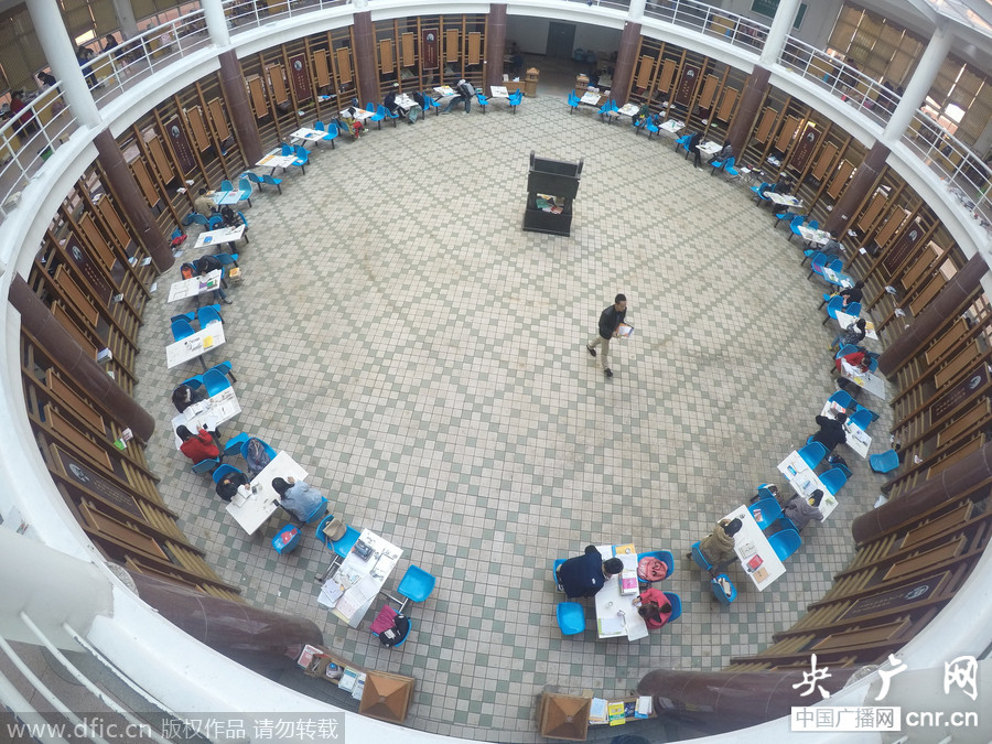 2014年11月13日,安庆师范学院龙山校区图书馆,一名考研学生在一楼寻找复习的座位。在图书馆一楼到五楼,几乎所有的桌位都为考研学子占据。