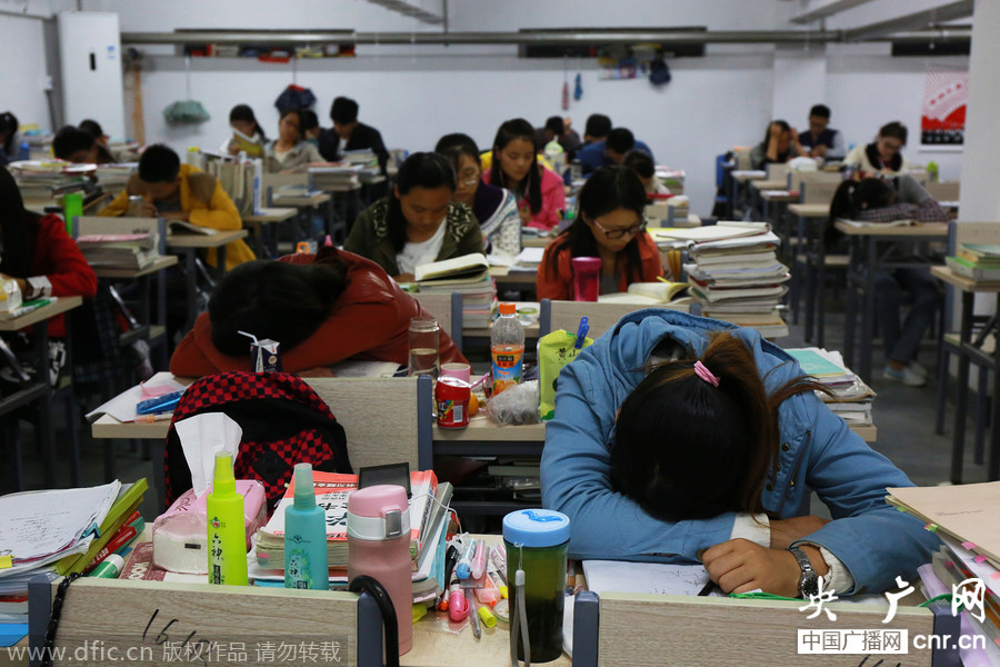 2014年10月22日,安庆师范学院校内考研自习室,学生们正在紧张复习,疲惫的学生趴在桌上进行休息。