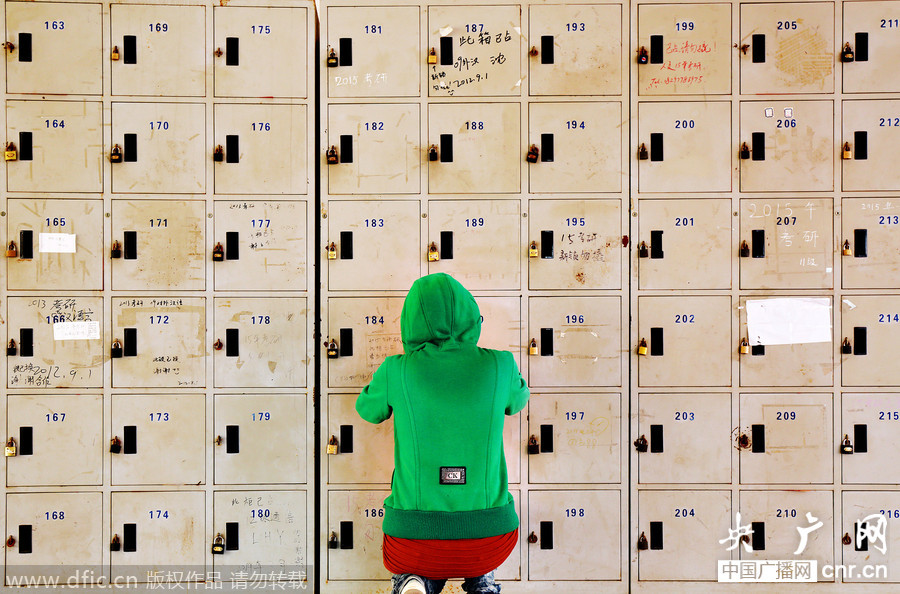 2014年11月4日清晨,安庆师范学院,一名考研女生在图书馆的存储柜取放资料。图书馆里数百个存储柜,上面被历年来的考研学子写满了“考研已占”等字样。