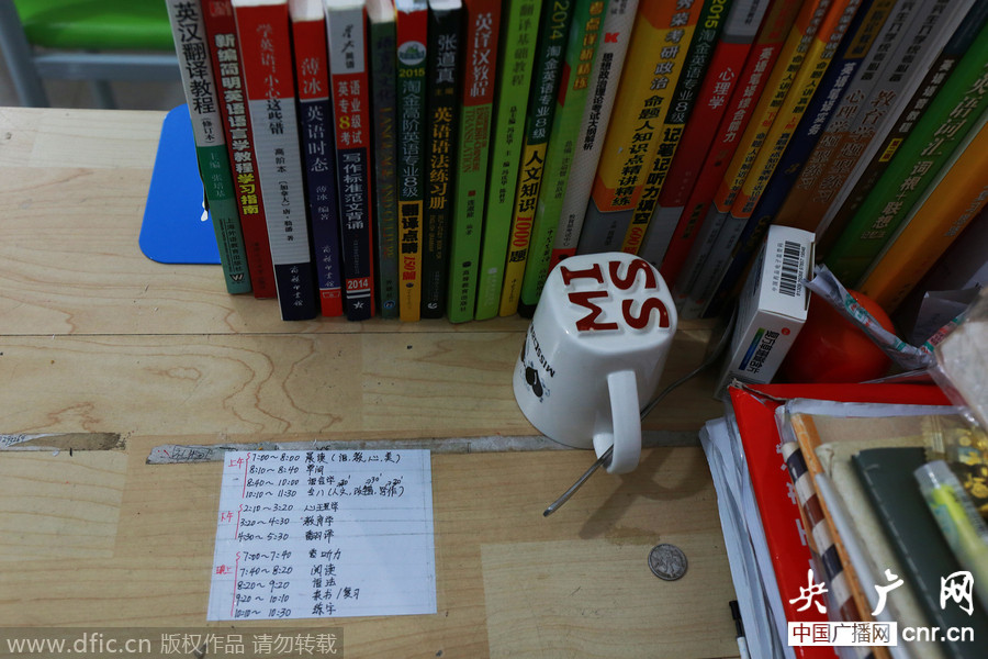2014年10月22日,安庆师范学院校园外一家考研自习室,一名学生将每天的学习计划贴在桌上。