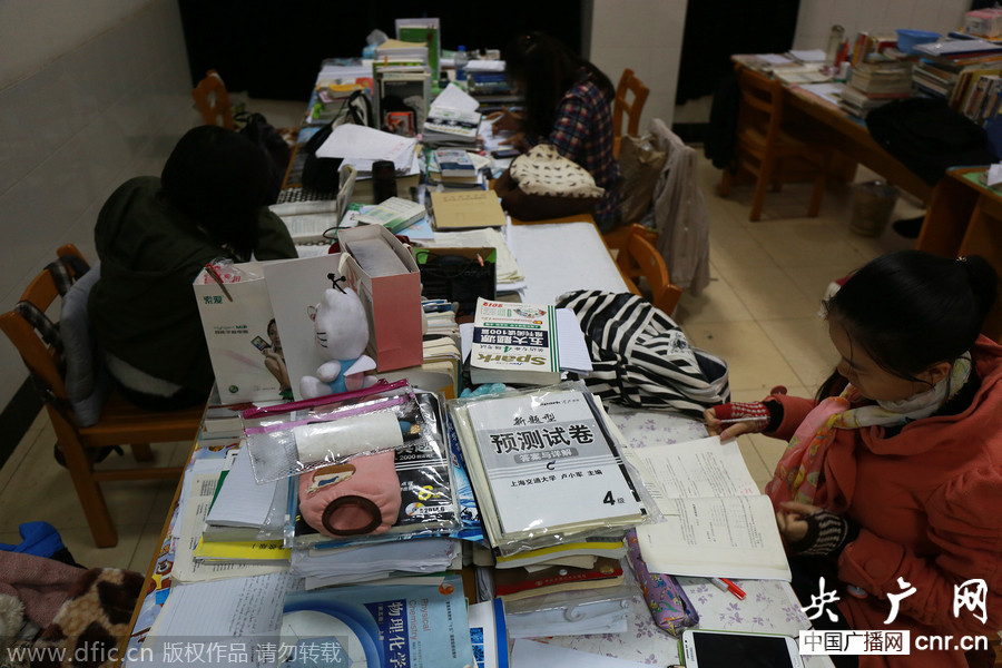 即使你对他们毫无了解,当你路过图书馆或者考研自习室时,你一定会震撼不已。桌子上高耸的书籍,自我鞭策的励志小纸条,埋头苦读的身影,无不随处可见。甚至那楼梯的拐角,那夜灯下空寂的长廊,那寒风中的避风港湾,无不是星星点点的他们。为了考研,他们甚至把棉鞋、毛毯、水瓶、方便面,都带到了看书的地方。那情景,真可以说是“安营扎寨”!