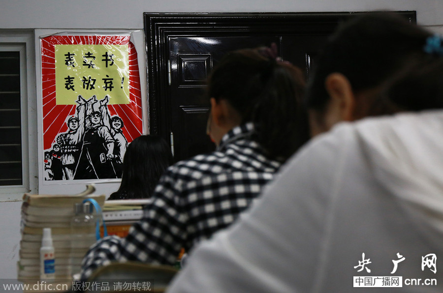 2014年10月22日,安庆师范学院校内考研自习室,“不要卖书、不要放弃”的激励话语贴在自习室的显目位置。