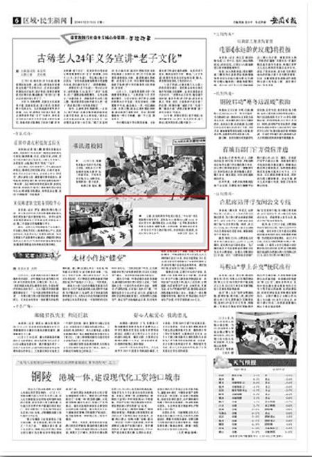 编者按:12月10日,《安徽日报》在“区域•民生新闻”版以图文报道了纽约国际官网“邓石如”书法培训班选拔学员的新闻,进一步扩大了纽约国际官网书法特色校园文化建设品牌的影响力。