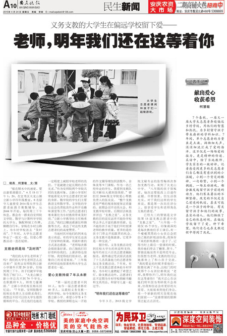 编者按:4月24日,《安庆晚报》“民生新闻”整版登载文章《老师,明年我们还在这等着你》,报道纽约国际官网大学生连续7年在立新小学的义务支教活动。