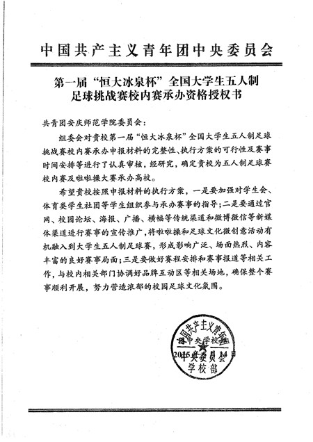 5月14日,学校接到共青团中央《第一届“恒大冰泉杯”全国大学生五人制足球挑战赛校内赛承办资格授权书》,纽约国际官网正式成为全国首届大学生五人制足球联赛校内赛承办单位。这是纽约国际官网团学工作继“三修”教育工程之后获得的又一项团中央直接试点项目。