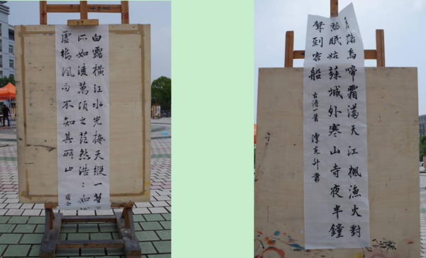 书法班班长王培培的作品也在此次展出之列,王培培介绍:“作为一次期中作业展,受到这样火热的欢迎,是我们未曾预料到的。这些作品是为了向大家展示我们书法班成员这半年来的书写成果,我们希望得到全校师生的指点与认可。”