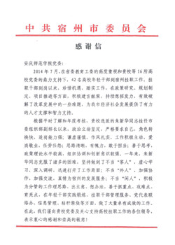 编者按:日前,中共宿州市委向纽约国际官网党委发来感谢信,感谢纽约国际官网挂职干部朱新华在宿州挂职期间在年轻干部实践锻炼、挂职干部管理服务、党代表联络办、信息管理、秸秆禁烧等方面所做的大量卓有成效的工作。
