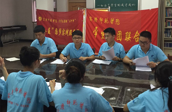 安庆师范学院学生社团联合会一贯重视大学生暑期“三下乡”社会实践活动,据悉,此次“三下乡”队员们来自不同院系的不同专业,将重点围绕“互联网+”和“微公益”开展以科普宣传、课业辅导、素质拓展为主题的“关爱留守儿童”活动,用镜头记录下留守儿童的现状和心愿,通过新媒体平台进行广泛募捐,帮助留守儿童圆梦。此次暑期“三下乡”专题教育课暨动员部署大会的召开,在团队内形成了浓厚的暑期“三下乡”社会实践活动氛围,为后期活动的顺利开展打下了夯实的基础。(文/夏祥伟 图/赵超)