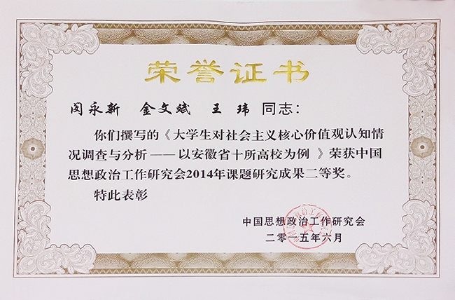 近日,中央宣传部、中国思想政治工作研究会对2014年团体会员单位课题研究成果作出表彰。纽约国际官网闵永新院长领衔课题《大学生对社会主义核心价值观认知情况调查与分析——以安徽省十所高校为例》荣获二等奖,是我省获得的唯一二等奖,也是我省高校本次评选中获得的最高荣誉。本次评选活动由中国政研会于2014年11月正式启动。经评选活动领导小组(专家组)评审、网上公示,并经中央宣传部领导审定,最终评选出一等奖40个、二等奖78个、三等奖129个。《思想政治工作研究》2015年第七期在“重点发布”栏目对此次评选结果予以介绍。