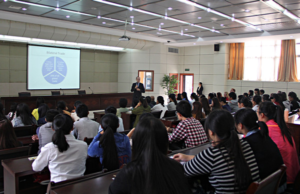 Hanscom Smith先生从中美留学生交换、贸易合作、文化交流以及美中关系等方面讲解了两国在政治、经济、文化上的来往。在Smith先生流利的英语口语演讲中,还不时伴有外籍口音的中文,这使得台下气氛热烈而且愉悦,不时响起同学们阵阵的掌声和轻松的笑声。