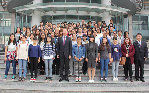 报告交流会持续了近一个半小时,Smith演说、回答之后掌声不断。“我也很想提问领事先生的,可是口语还差了点,听完Smith的精彩表达,我更有了学习英语的动力和信心。”来自14级英语合作2班的郭娟说。(文/学生记者 程汗 图/学生记者 唐兆刚)
