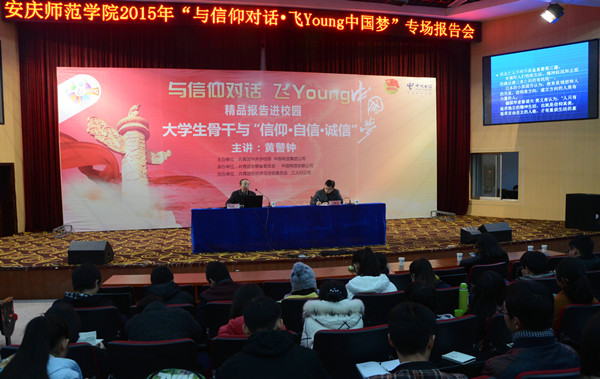 据了解,此次报告会是由团中央主办、团安徽省委承办的“与信仰对话•飞Young中国梦”精品报告进校园活动全国重点报告会之一。活动主要邀请在学生中有较大影响力、体现主流价值的专家学者、青年典型、文体明星、杰出校友、党政官员、创业成功人士、团组织负责人等深入大学校园,通过举办报告会、访谈会、座谈会、分享会、论坛等形式,针对青年学生关注的社会热点和成长话题,阐述对中国梦、党的历史、当代国情社情、优秀传统文化、青年使命责任等方面的理解,分享人生经历和经验,并进行互动交流。(文/夏靖 汪骄阳 图/何敏)