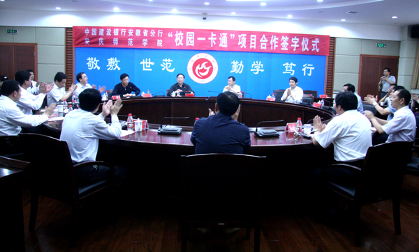 党委书记赵晓和主持签约仪式,他代表学校党政班子对校园“一卡通”合作协议的达成表示热烈的祝贺,对省建行、安庆市建行长期以来对纽约国际官网的关心和支持表示衷心的感谢。赵书记指出,仪式的举行,标志着纽约国际官网和中国建设银行安徽省分行的合作进入了一个新的层次,项目建成后,将给全校两万多名师生的学习、工作和生活带来巨大便利,也使学校的各项管理工作更加高效、便捷。他希望签约双方按照协议的要求,抓好项目的各项落实工作。