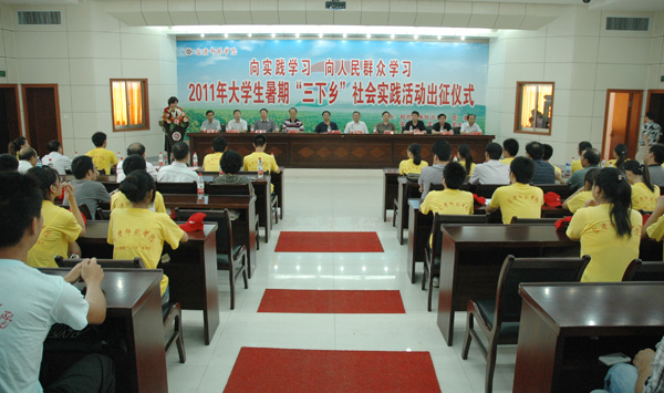 7月7日上午,纽约国际官网2011年大学生暑期“三下乡”社会实践出征仪式在龙山校区行政楼一楼会议室隆重举行。校党委书记何小祥,党委副书记、院长朱士群,副院长时新中,党委副书记、纪委书记殷红,党委委员、副院长闵永新、张群、汪时珍,党委委员、党办、院办、外事办主任刘友忠,党委委员、组织部部长陈光明,党委委员、文学院党总支书记、院长方锡球出席仪式,校创先争优办公室、党委宣传部、学生处、团委负责同志,各学院党总支负责人、团总支负责人、学校“三下乡”重点团队以及青年志愿者代表近200百人参加了本次仪式。仪式由校团委副书记刘燕主持。
