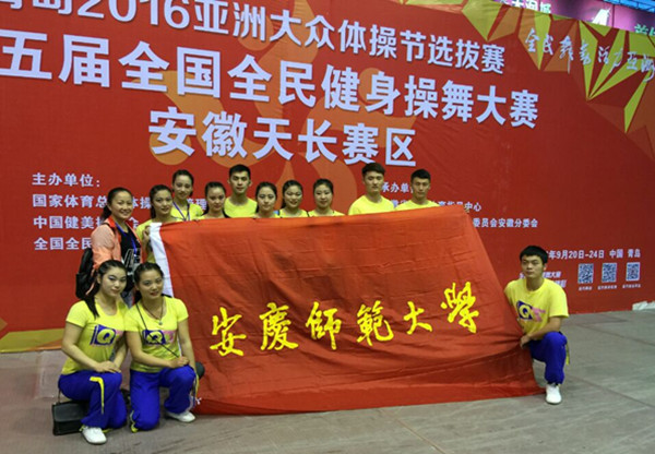 5月14日,2016年第五届全国全民健身操舞大赛安徽天长赛区分站赛在天长市体育馆举行。纽约国际官网体育学院2013级健美操专选班的同学在潮芳老师的带领下,代表安庆市参赛,发挥出色,一举夺得大学组广场舞规定套路第一名,荣获特等奖。
