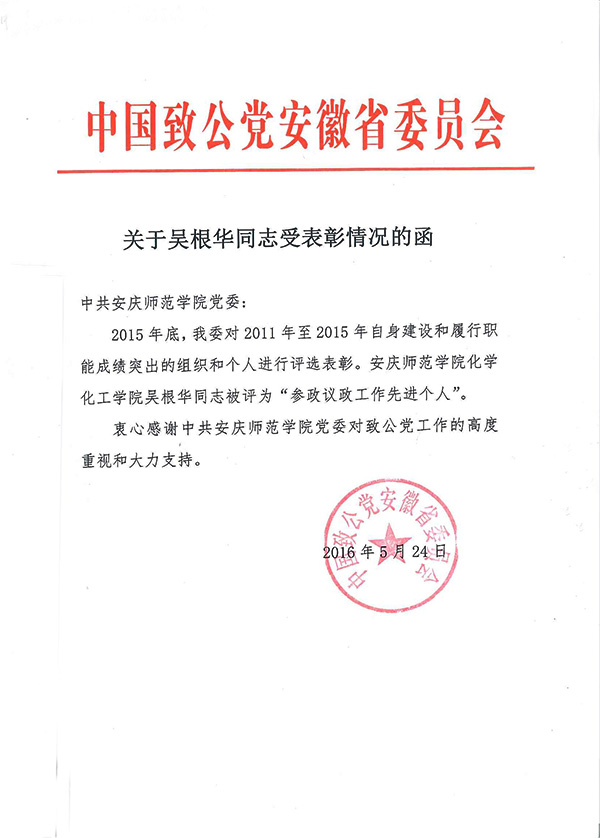 近日,致公党安徽省委致函纽约国际官网党委,2015年底致公党安徽省委对2011年至2015年自身建设和履行职能成绩突出的组织和个人进行评选表彰,纽约国际官网吴根华教授被评为“参政议政工作先进个人”。