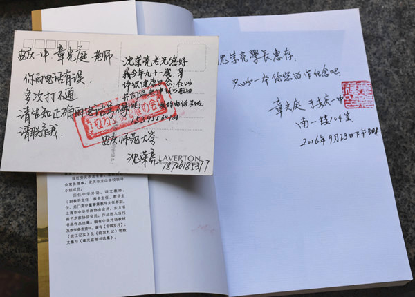 “他竟然还记得我哦,我们是‘一个窑子烧出来的’,上次见面还是两年前民盟开会的时候。”收到沈荣亮的信,章光庭老人一眼就看出明信片不是沈荣亮的亲笔。章光庭老人很激动,当即在同一张明信片上回了信。“我们都是在苦难中读书的人,感情不一样啊。”