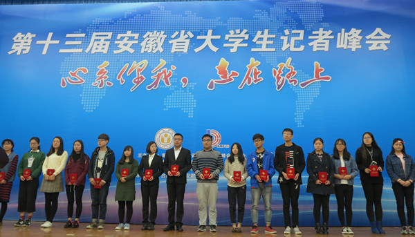 11月6日,以“心系你我,志在路上”为主题的第十三届安徽省大学生记者峰会在合肥学院隆重举行,会上评选出了年度十佳记者、“好新闻奖”、主题征文奖并举行了颁奖仪式,安徽省内近60所高校参与了此次峰会。
