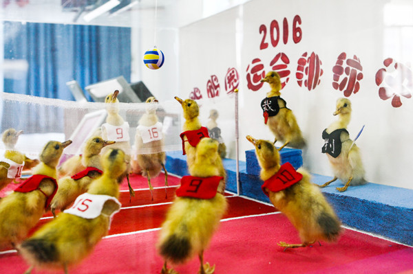 完成这样一幅作品,整个团队用了42只鸭子,观摩数遍女排夺冠视频,才得到最好效果的标本。据指导老师穆丹介绍,在团队把制作的鸭子标本放到活的小鸭子中间,会有小鸭子过来和标本小鸭子“交谈”。