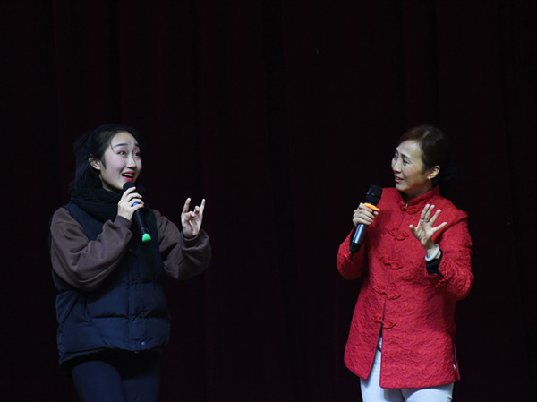 涂老师从中国传统文化的角度讲解了戏剧艺术的起源与发展,并现场教授如何欣赏与体验中国戏剧。有着45年从业经验的她,对中华传统戏曲文化有着深入而独到的理解。“戏曲者,谓以歌舞演故事也,戏曲是中国社会产生的独特艺术。”涂教授为师生介绍了中国戏曲发展脉络及艺术特征,并现场表演和讲解了唱、念、做、打的要点。一折扇、一挥袖、一扬鞭,经典的戏曲做派水袖、走马、耍花枪从荧屏走向舞台,引得现场师生连连叫好。歌唱与具有韵律感的念白,二者相辅相成,舞蹈化的形体动作与武打技艺二者相互结合,引得全场阵阵掌声。