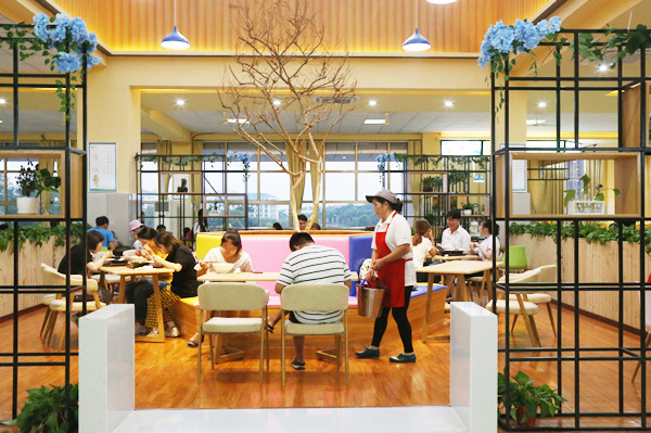 多功能区四周用铁艺书架等进行围合,设置了六边形的卡座,卡座中间还种植了一棵树,周围分布着多肉植物和绿植。“食堂设计得这么好,我感觉以后点外卖的次数都会少很多。”地理科学专业2017级的李小红说。