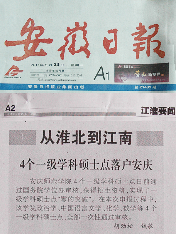 《安徽日报》:4个一级学科硕士点落户安庆