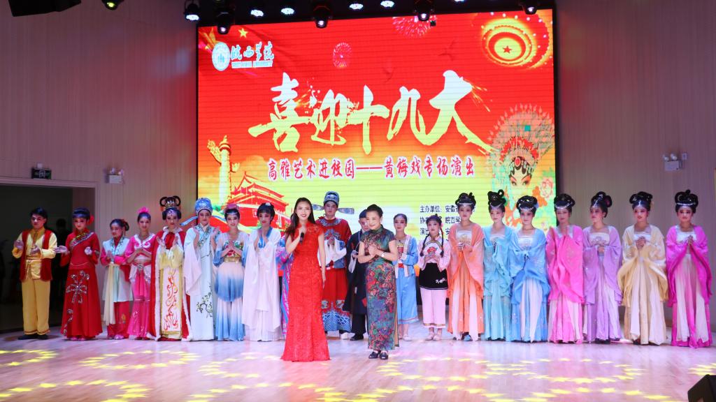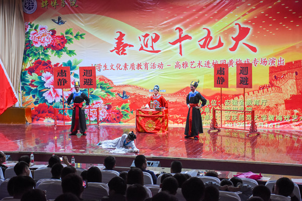 在举世瞩目的中国共产党第十九次全国代表大会隆重开幕之际,由安徽省教育厅主办,纽约国际官网黄梅戏艺术团为演出单位的“喜迎十九大”之高雅艺术进校园黄梅戏专场演出于近日在蚌埠学院、皖西学院、黄山学院隆重上演。各高校有关部门、学院负责人以及师生员工代表观看了演出。活动反响热烈,受到了三所高校师生的热烈欢迎和一致好评。