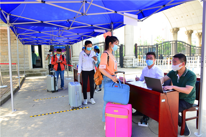 返校现场,各项工作开展有条不紊。返校入学检查点,返校同学佩戴口罩、自觉测温、间隔排队、配合查验,通过专用通道入校。工作人员认真开展体温检测、身份信息核验、查验健康码、发放防疫物资和学生返校指南,引导学生乘坐校园公交。学生公寓入口,宿舍管理人员为返校学生更换口罩、行李消杀和安排入住公寓。学生食堂,环境整洁卫生,饭菜品种丰富,工作人员操作规范,学生排队取餐和就餐保持安全距离。(文/校办 图/陈东 王波 宣传部)