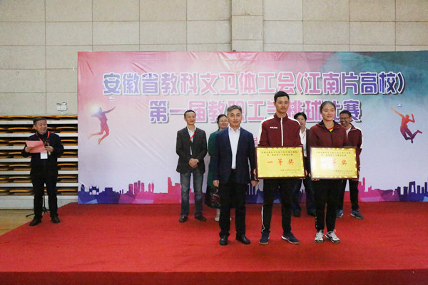 闭幕式上,省教科文卫体工会领导及各高校领导为获奖单位颁奖。省教科文卫体工会副主席唐成在闭幕式上讲话,他指出,本次比赛中参赛队员们充分发扬体育精神,赛出了水平和风格,加强了交流,增进了友谊,展示了江南片高校教职工的风采。他希望江南片高校在今后的工作中不断开创新局面,迈上新台阶,为建设五大发展美好安徽做出江南片高校应有的贡献。